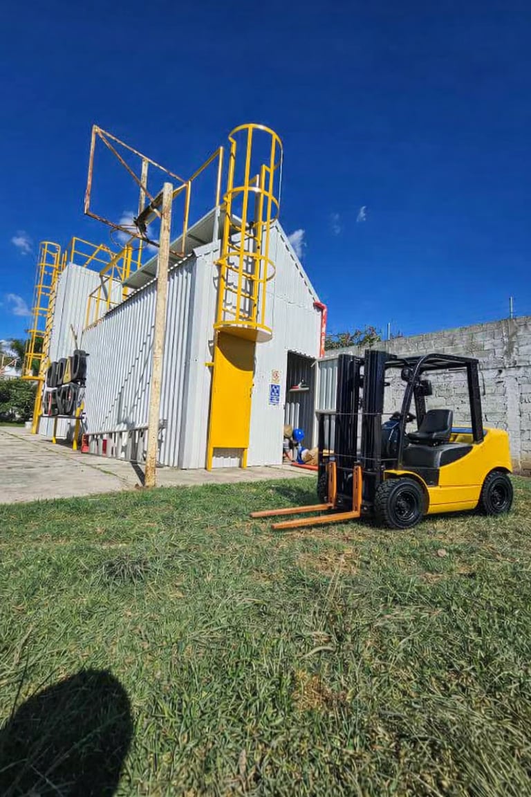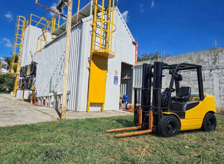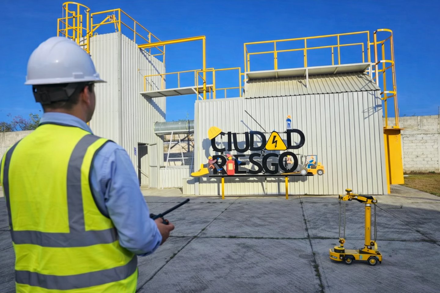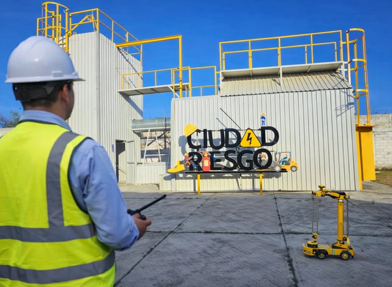 CIUDAD RIESGO simula ser una fábrica con todas sus áreas existentes por lo que el almacén de la grúa viajera se integra perfectamente al ejercicio de operación de montacargas, estibando y trasladando las tarimas, palets, toneles, etc.