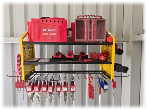 Espacio adaptado para realizar ejercicios de candadeo y etiquetado con diversos dispositivos mecánicos, válvulas que simulan energías neumáticas, hidráulicas, e interruptores eléctricos, y energias remanentes reales.